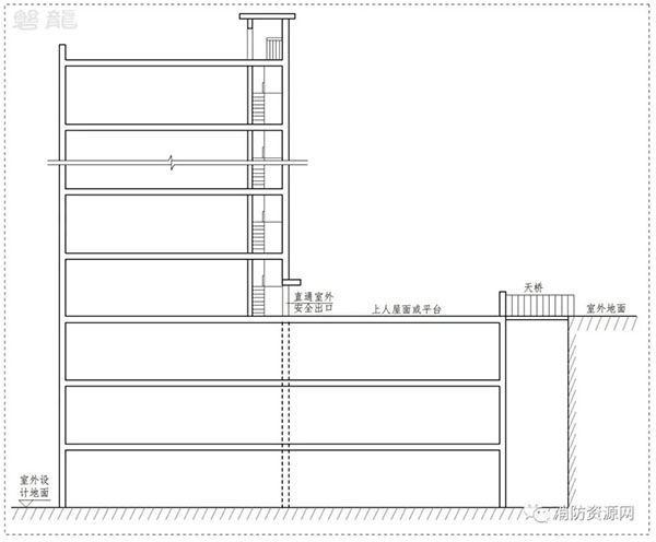 1.1 上人屋面或平台与地面直接连通,或通过天桥直达地面(图示3):