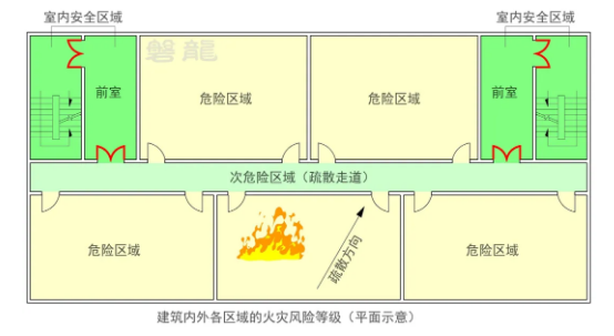通常认为,在火灾条件下,当人员进入室内安全区域时,即可视为到达安全地点【图示1】,不再将室内安全区域至室外安全区域的疏散时间和距离纳入控制要求。参考专题:火灾风险等级与阶段疏散策略。