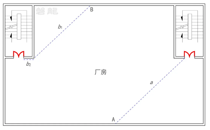 示例1:【图示7】所示的厂房,A点至最近安全出口的距离为a,B点至最近安全出口的距离为b1+b2。