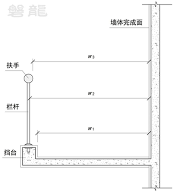 【图示5】中的外廊走道,净宽度应从挡台、栏杆、扶手的最内缘起算,取w1、w2、 w3最小值。