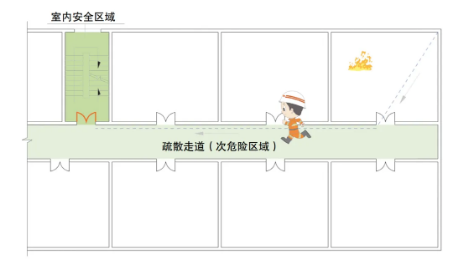 室内房间属于危险区域,一旦发生火灾,人员应迅速疏散至相对安全的次危险区域(疏散走道),通过疏散走道疏散至安全出口【图示1】。