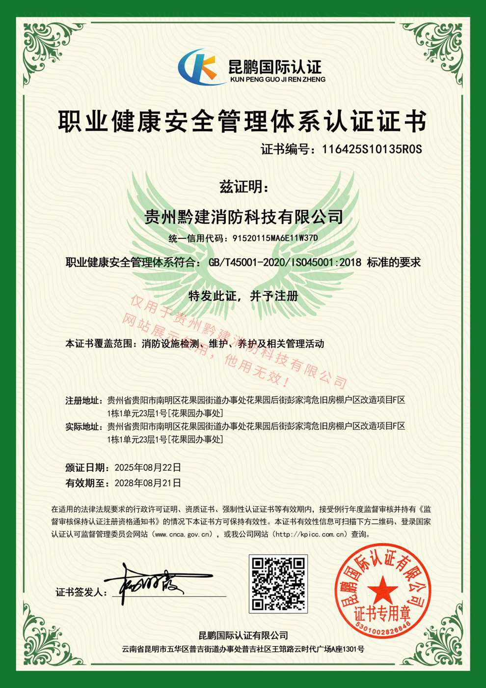 职业健康安全管理体系认证证书