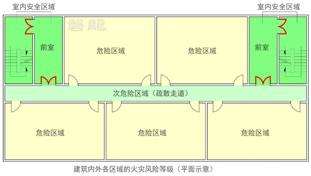 (2)根据火灾风险程度,将建筑空间划分为危险区域、次危险区域、室内安全区域和室外安全区域;