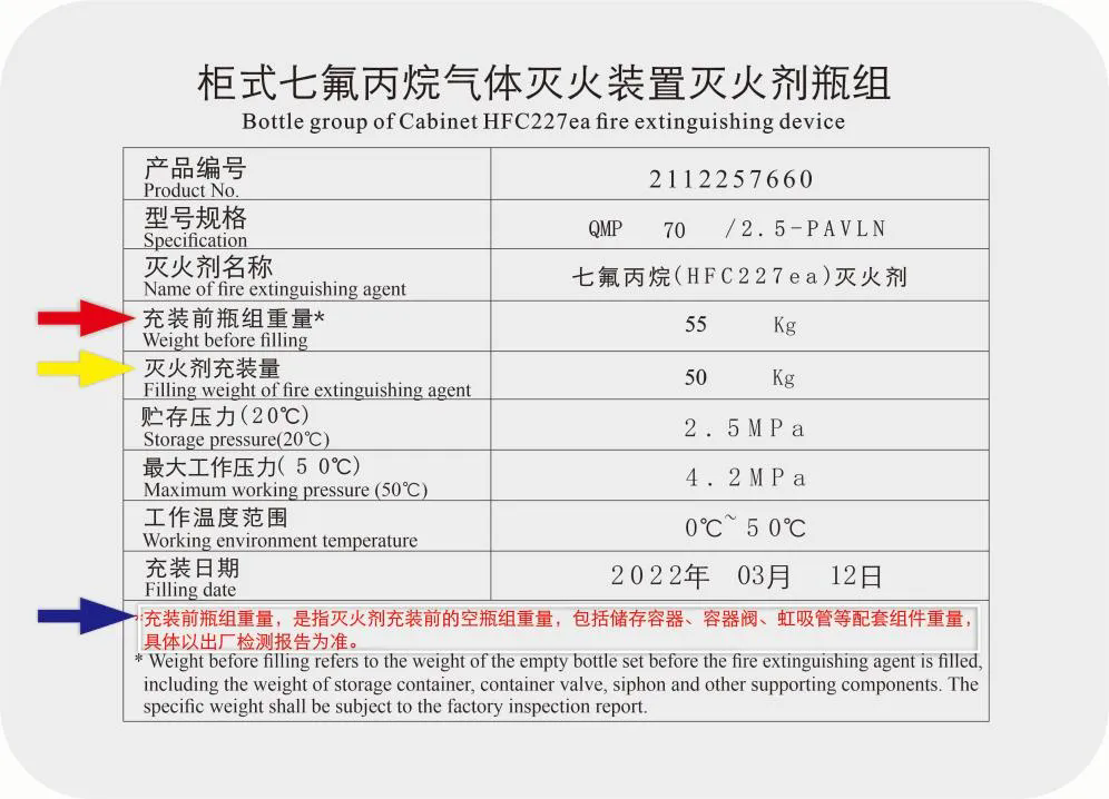 (1)仅标识“灭火剂充装量”:缺失了瓶组本体的基准重量,现场验收或日常检查时,无法通过简单称重反向推算出实际灭火剂存量,监督检查形同虚设。
