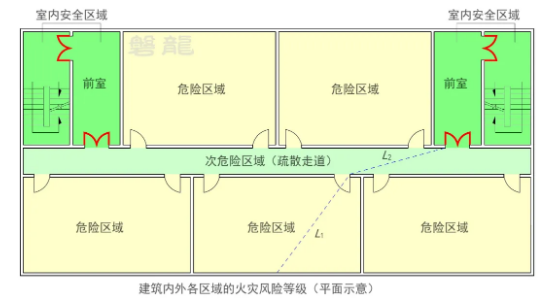 由此可见,消防安全疏散距离的控制,通常是指从危险区域或次危险区域内任意一点至最近安全出口的距离控制。