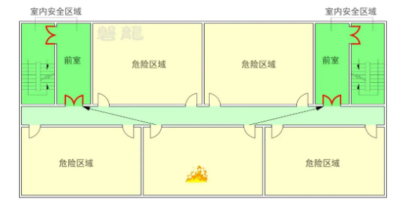 民用建筑主要用于人员居住与公共活动,通常采用“房间—走道—楼梯间”的空间组织形式。通过适当提高走道的防火性能,可将其构建为具备一定防护功能的疏散走道(次危险区域),并适度放宽其最大允许疏散距离,从而有利于建筑功能布局和安全疏散。