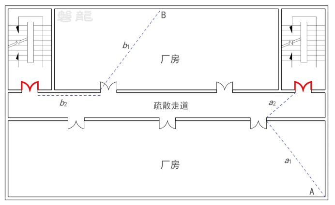 示例2:【图示8】所示的厂房,A点至最近安全出口的距离为a1+a2,B点至最近安全出口的距离为b1+b2。