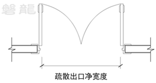 双扇疏散门的净宽度为两扇门同时呈 90°角打开时,两扇门相对表面之间的水平距离。