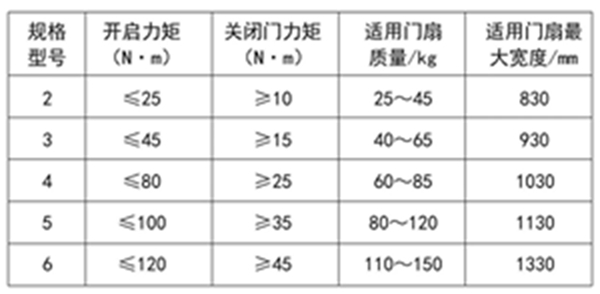 表1 防火门闭门器规格